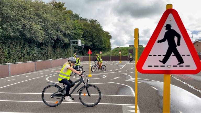 Skolen er nemlig placeret i et område med sparsom offentlig transport, og derfor skal børnene cykle til stort set alt – både i fritiden og i skoletiden. Med den nye trafikbane har Blåbjergskolen således fået mulighed for at gøre børnene fortrolige med cyklen, og i bogstaveligste forstand vise dem, at man skal stoppe, når der er hajtænder, og at man skal række armen ud, når man cykler ud af en rundkørsel.